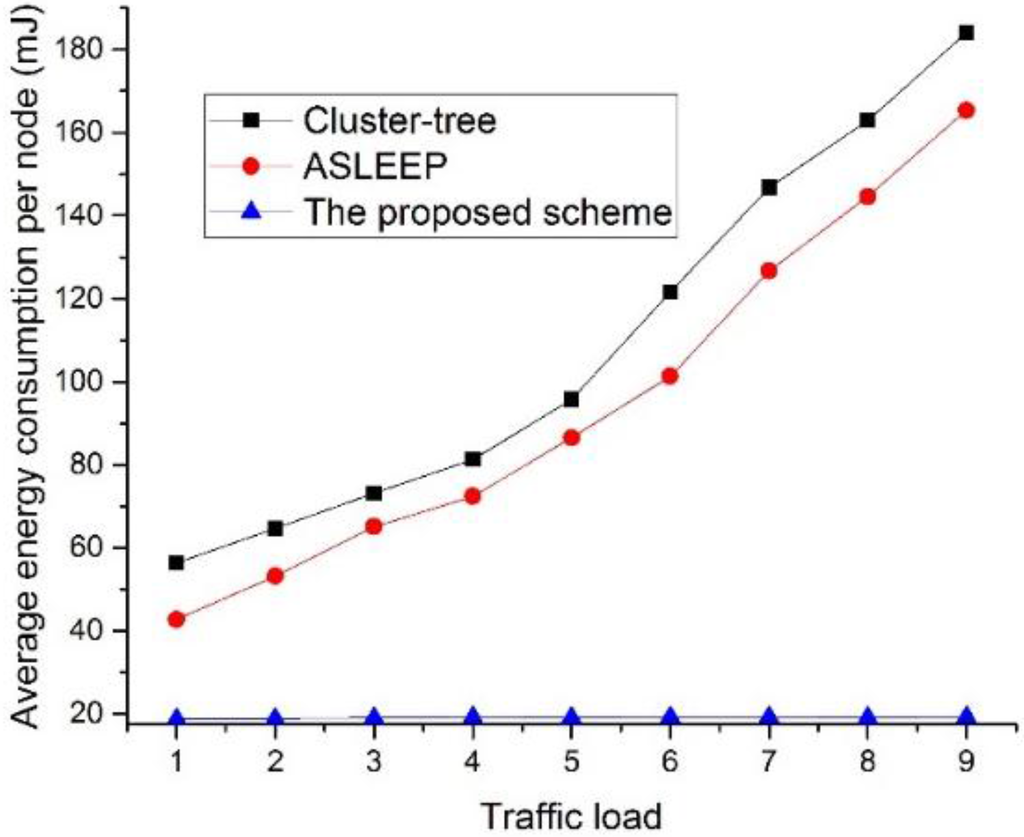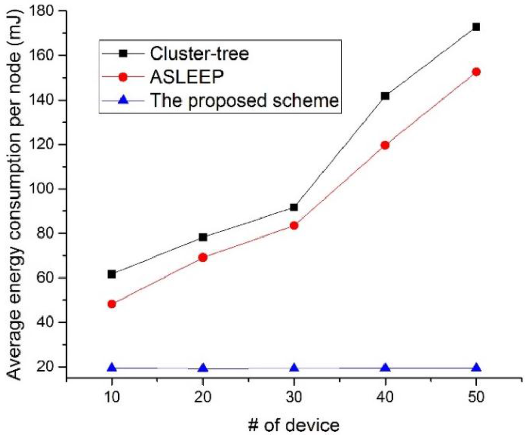 In this simulation, the traffic load in the network is fixed to 5. As shown in Figure 25, the energy consumption of the device using the IEEE 802.15.4 cluster-tree scheme and the ASLEEP scheme increases as the number of devices in the network increases. This result is because the contention overhead for the channel access increases and the channel listening occurred by the contention or the retransmission by the collision increases as the number of nodes in the network increases. Thus, the energy consumption of the device that uses the IEEE 802.15.4 standard or the ASLEEP scheme increases in proportion to the number of nodes. However, in the proposed scheme, the energy consumption of the device that uses the proposed scheme is not influenced by the number of devices in the network since it can transmit the real-time data without the contention for channel access. Therefore, the energy consumption of the proposed scheme is superior to the energy consumptions of two legacy protocols.