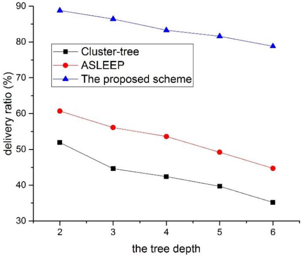 As shown in Figure 26, the delivery ratio of three protocol decrease as the tree level of the network increases. In particular, the network performance of two legacy protocols decreases largely. This result is related to the fact that the contention for the channel access and the frame error probability increases as the tree level of the network increases. In Figure 26, because the ASLEEP protocol can slightly adjust the superframe duration within the limited bounds, it can provide the transmission probability higher than the cluster-tree protocol. Therefore, the ASLEEP protocol provides the performance of the delivery ratio higher than the cluster-tree protocol. However, because coordinators in the ASLEEP protocol also contend with other leaf nodes, the frame error rate or the collision increases according to the increase of the tree level. Thus, the performance of the ASLEEP protocol decreases largely. Meanwhile, in the proposed scheme, a coordinator does not contend with other leaf nodes for the channel access since it relays data frames to the next hop coordinator in the CFP. However, the frame error rate of the end-to-end link increases as the tree level of the entire network increases. Therefore, the delivery ratio of the proposed scheme is inversely proportional to the tree level of the network, but the proposed scheme is superior to two legacy protocols.
