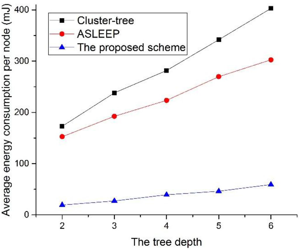 As shown in Figure 28, apparently, the proposed protocol obtains the lowest energy consumption. In two legacy protocols, the contention overhead for the channel access increases and the channel listening occurred by the contention or the retransmission by the collision increases as the tree level of the network increases. Thus, the energy consumption of the device that uses the IEEE 802.15.4 standard or the ASLEEP scheme increases in proportion to the tree level of the network. Of course, the energy consumption of the proposed scheme is proportional to the increase of the tree level. However, the energy consumption of the proposed scheme is superior to the energy consumptions of two legacy protocols. This is because the retransmission or the transmission attempts by the collision or the frame error of the proposed scheme is the lowest.