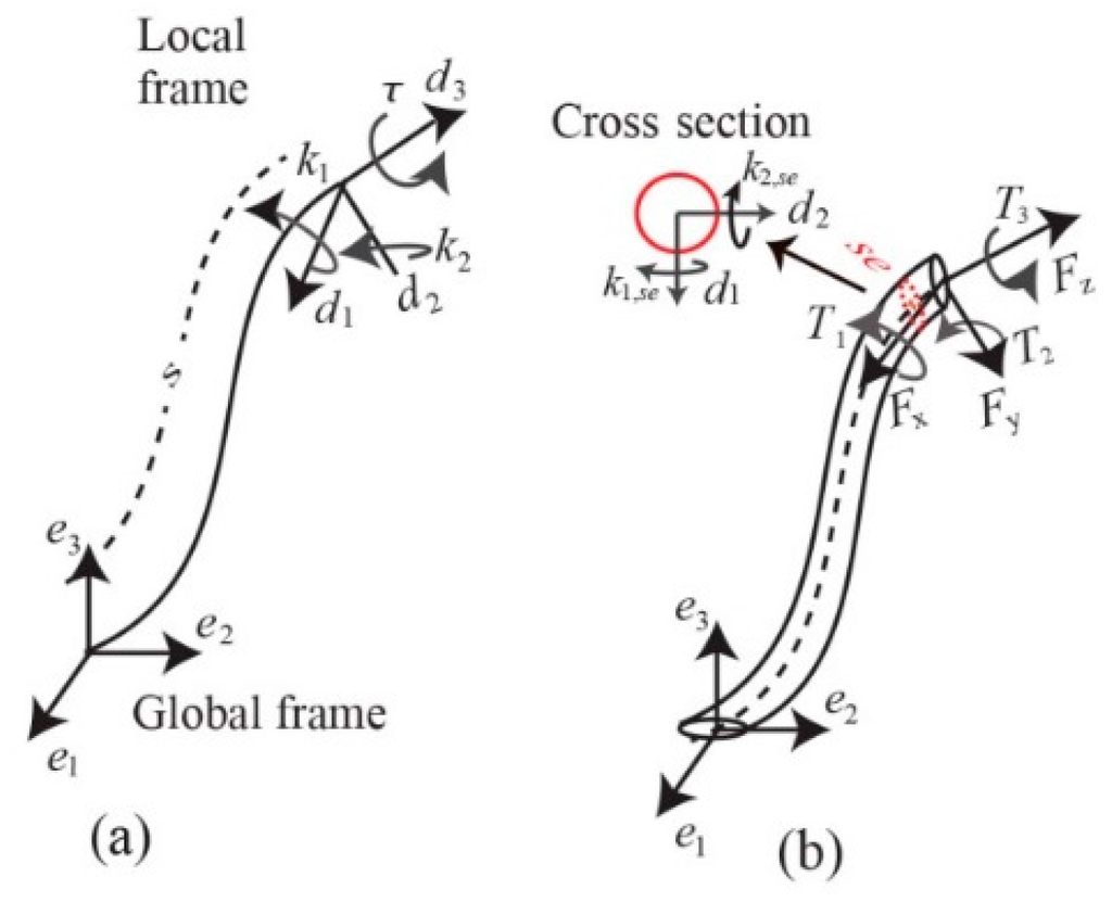 An elastic rod with an unstretched length L is characterized by the global coordinate frame represented in Figure 2a. The vector r(s), locates the centerline of the rod with respect to the global coordinate. The local frame attached to the curve along the centerline demonstrates the orientation of each point on the rod relative to the global frame. The director is adopted to be tangent to the centerline at each infinitesimal segment of the rod and and define the local frame on the cross-section of the rod. The velocity vector defines shear strain along and by the first two components, and axial compression or stretch along by , where superscript l indicates definition with respect to the local frame. With the shear strain and elongation being negligible, the change of the rod’s position with respect to arc length becomes,