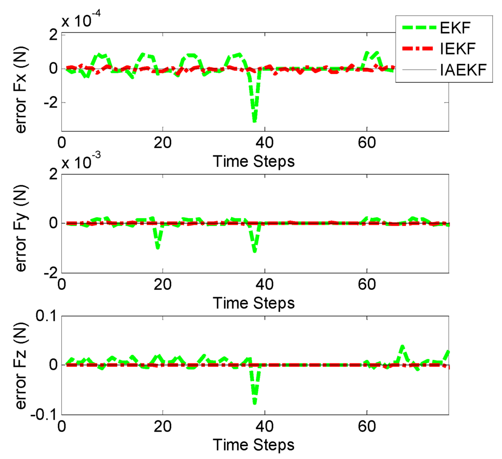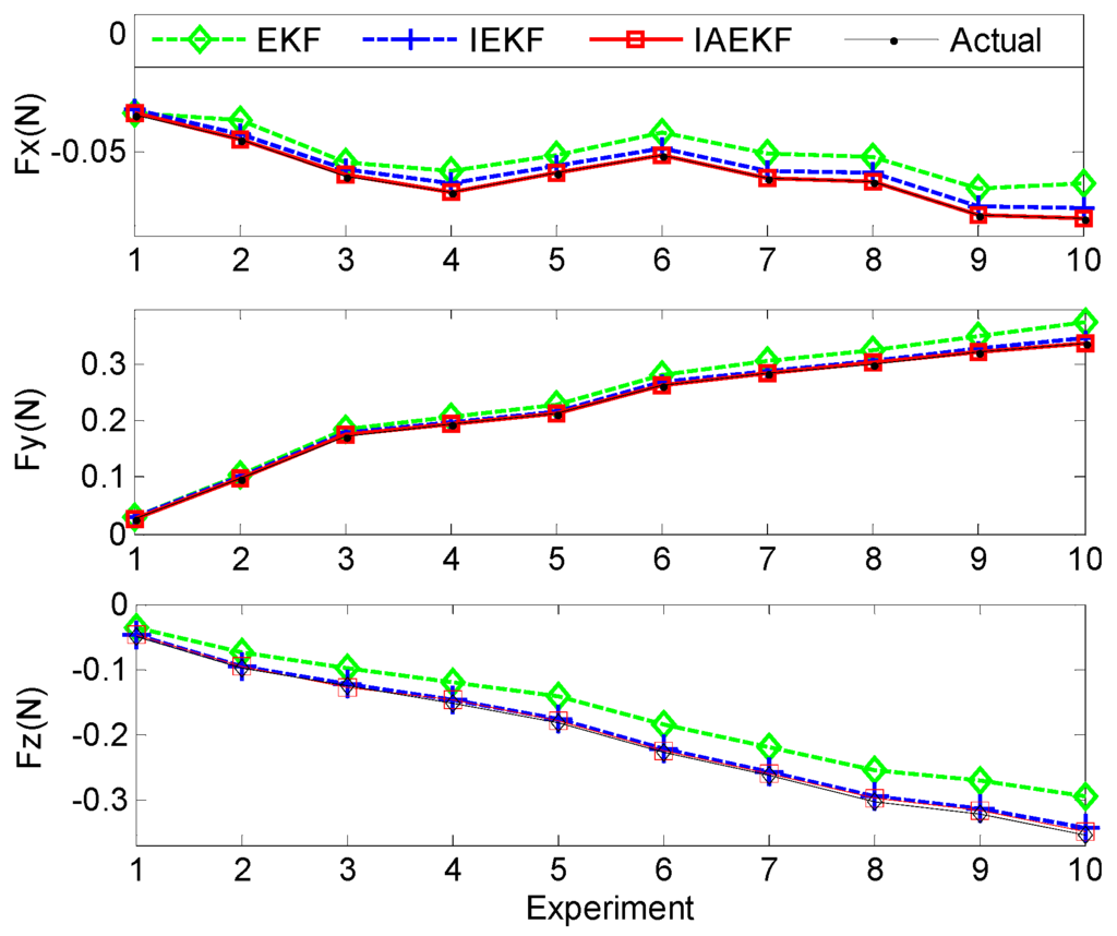 - Measurement noise covariance matrix, : The convergence of KF-based approaches depends on the measurement noise covariance matrix. Five different measurement noise covariance matrices with diagonal elements with defined in Section 4.1, were adopted to study the sensitivity of the method to measurement noises. Table 4 compares the root mean square error (RMSE) for different methods with the applied force along x direction, with 15 samples per second. As it can be seen, IAEKF and IEKF show more robustness to changes of noise covariance matrix.