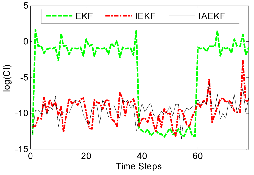 In the end, the execution times of the proposed approaches are compared. Table 6 illustrates the mean value of computational time of the methods for the simulations. The simulations are performed in MATLAB 2013a® with Core i3 2.2 GHz, 4GB RAM laptop. The results show that IEKF, IAEKF take longer execution time, mostly due to the iterative nature of the schemes. Numerical Jacobian calculation leads to higher computational time that can be compensated by exploiting faster computers, and running the codes in C/C++.