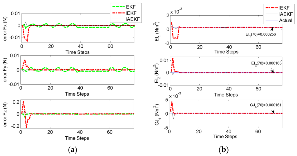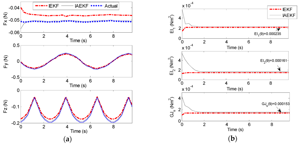 In previous studies, stiffness was assumed to be as an invariant parameter of the system [15,17]. However, this parameter might change as a function of structural specifications of the catheter and different environmental conditions, e.g., environmental temperature [22]. For this purpose, CFSE was tested. The process covariance matrix was assumed to be , and was defined equal to that of CFE in Section 4.1. With the tip contact force represented in Figure 3, the error of force and stiffness estimations are indicated in Figure 7a,b, respectively. The results demonstrate that IEKF and IAEKF provide estimates of contact force with the maximum average error of −0.0016 ± 0.0036 and 0.0008 ± 0.0054, respectively, and stiffness estimates with −1.59 × 10−4 and 1.28 × 10−5, respectively. The results for EKF-based stiffness estimation due to its divergence have been eliminated. The increased inaccuracy of force estimation is mostly due to high error at the first instants of estimation. Although there is an increased error of contact force estimation compared to that of CFE, the proper choice of measurement vector yielded to convergent estimations for both IEKF and IAEKF. However, depending on the parameters to be estimated, the number of measurement points could be increased.