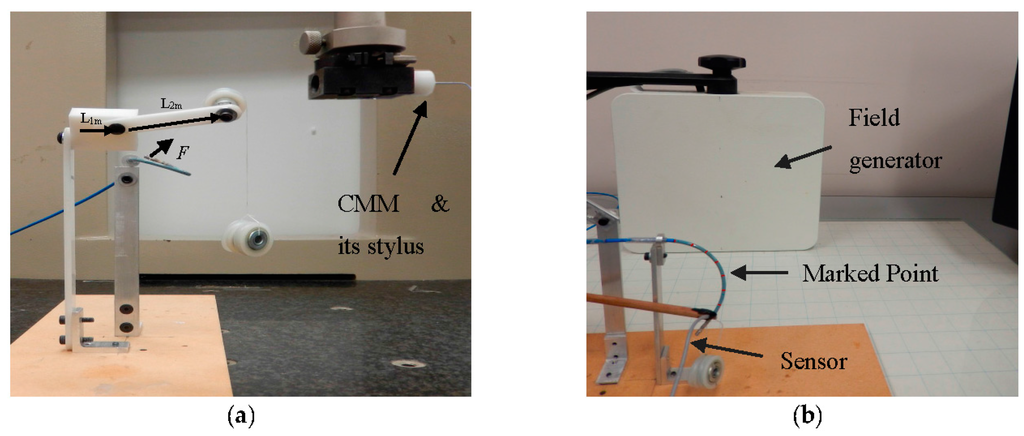 Experimental setup: (a) Loading mechanism with two moving links (L1m and L2m), pulley and weights; (b) Measurement system.