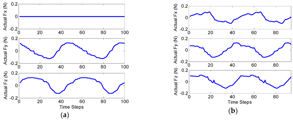 True values of external forces applied to the catheter tip: (a) and quasi-sinusoidal planar force exertion; (b) and quasi-sinusoidal spatial force application.