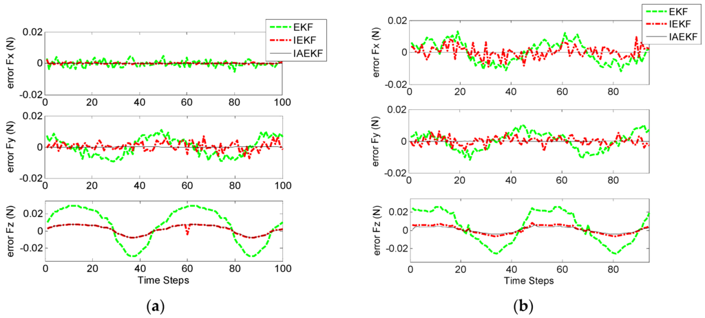 Figure 9 shows the true values of planar and spatial forces applied to the end of the distal shaft with initial curvatures of and respectively. Each experiment was repeated three times for verifying the repeatability of the introduced methods. Figure 10a,b represent the corresponding errors of estimation for aforementioned contact forces performed by EKF, IEKF, and IAEKF. For better comparison of the results, the average error values and corresponding standard deviation of estimations are summarized in Table 7. The entries of the measurement covariance matrix were taken to be 1000 times that of the determined to account for the measurement uncertainty due to high sensitivity of the EM tracking system to trivial distortions. The results show that IAEKF has the highest accuracy with the maximum average error value along axial direction with the precision of 0.001 ± 0.0041 N. However, the force estimations provided by IEKF and IAEKF are comparable with the existing force sensors [11] and estimators [18].