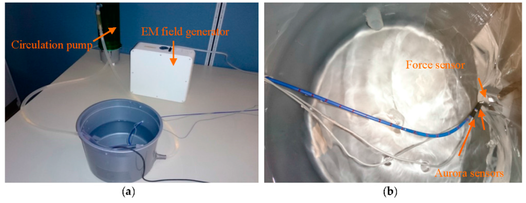 In the second set of experiments, CFSE and CFE were evaluated in a simulated environment of intra-cardiac catheterization. For CFE, the setup in Figure 11a was prepared. The water circulation pump (EHIEM, Deizisau, Germany) circulated the saline water in the bucket mimicking the blood flow in intra-cardiac chambers. The force sensor (Nano 17, ATI, Apex, NC, USA) was attached to the bucket wall to interact with the catheter tip while measuring the tri-axial contact forces. The catheter was bent with initial curvature of Two Aurora sensors were attached to the catheter distal shaft to provide tip pose, curvatures and torsion of the second-last segment required for force sensing as illustrated in Figure 11b. The sensors were placed 4.7 mm apart and calibrated to measure the desired poses of the two end segments.
