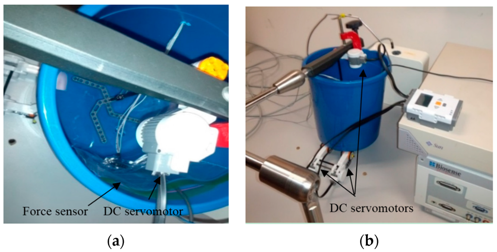 In the second scenario, the setup in Figure 13 was prepared for CFSE. To simulate the beating heart as the dynamic interacting contact load of the distal shaft, two DC servomotors (The Lego Group, Billund, Denmark), a bucket accommodated on top of the motors, and the force sensor attached to the bucket wall, as represented in Figure 13a,b, were incorporated. The distal shaft tip was in contact with the force sensor and the motors were connected together and were moving the bucket. The bucket was translated with a frequency and sampling time of approximately 0.21 Hz and 0.3 s, respectively, to comply with the computational requirements of CFSE framework. However, the computational costs easily can be reduced as mentioned in Section 4. In cardiac catheterization, the blood flow has the most significant effect in making disturbances in both sensor readings and process model. In this scenario, water was circulated with the other DC servomotor as illustrated in Figure 13a. Force and EM sensors were calibrated and attached to the bucket wall and distal shaft, respectively, as in the first scenario of Experiment II.
