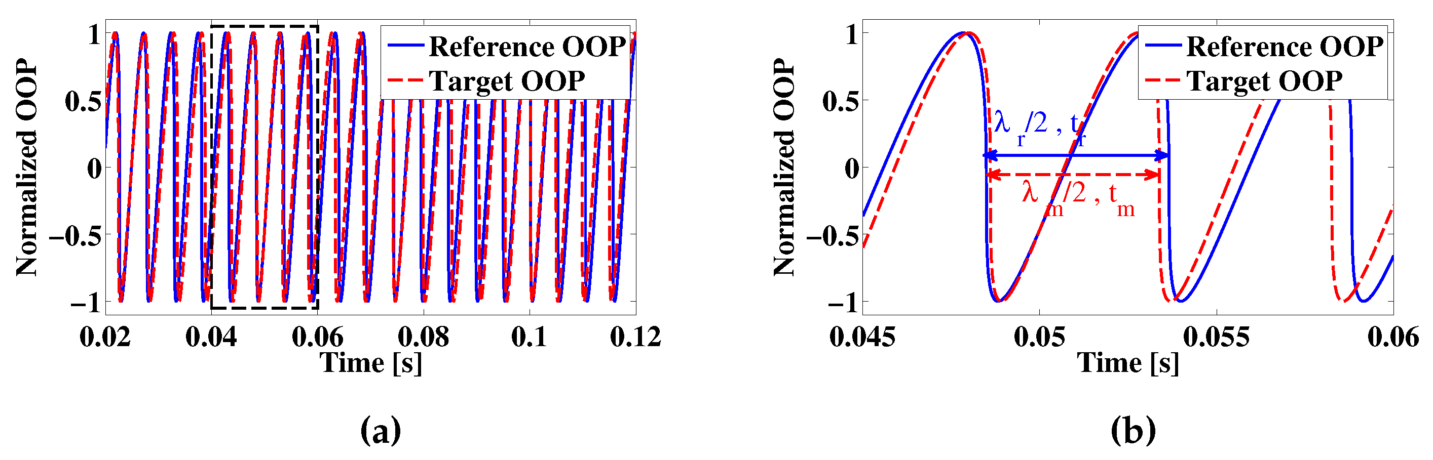 Simulated fringe position change on a measurement signal as a result of a target displacement. The subindex r is used for the reference signal and m for the measurement signal. (a) Comparison between a simulated reference OOP (solid line) and a simulated OOP during target displacement(dashed line); (b) Zoom around the region inside of the dashed rectangle in (a).