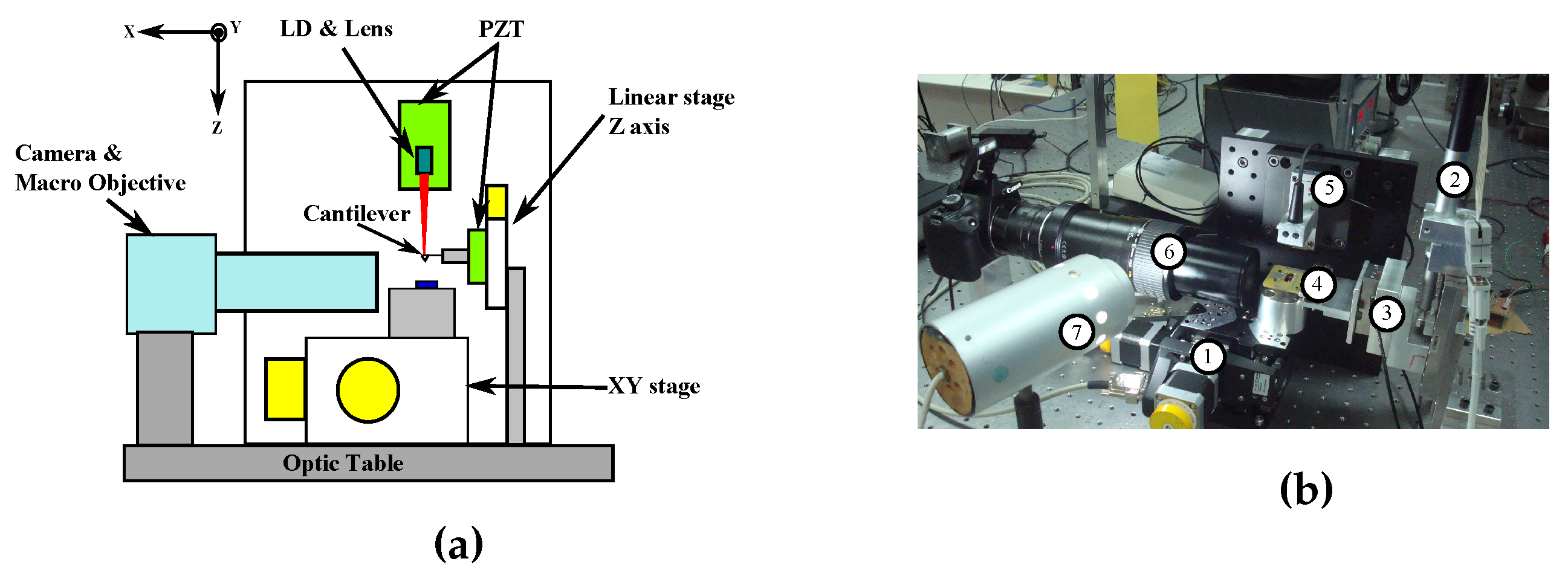 The mechanical setup consists of 2 PI XY LS-120 stepper motor tables (labeled as (1) in Figure 3b) with a step resolution of 0.2 m and a maximum travel length of 40 mm, which will be used in later stages to change the relative position between a sample surface and the cantilever probe. A PI M-227.50 translation stage (labeled as (2)) is used to control the Z-axis positioning of the cantilever with a resolution of 50 nm. A PI-LISA piezoelectric (PZT) stage (3) with a maximum travel length of 25 m is used to generate a sinusoidal motion for the cantilever holder (4) and the cantilever. The PZT includes an internal capacitive sensor with a maximum resolution of 2 nm, which will be used in the measurement for comparison purposes. An AppNano SHOCONA cantilever with aluminum coating was selected as the target and experimentally characterized yielding an experimental resonance frequency of kHz, a quality factor on air of and a length of m.