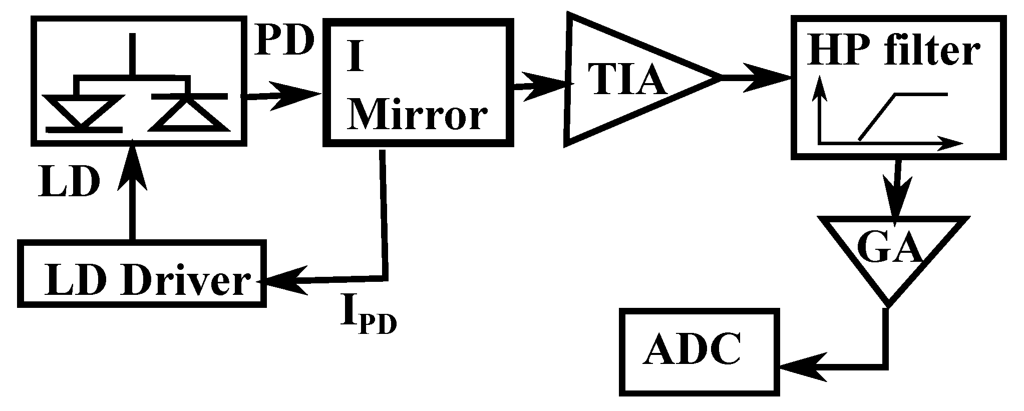 Electronic scheme of the mechanically-modulated OFI analogue acquisition and preconditioning stage. The PD current is passed through a current mirror (I mirror) to prevent loading effects on the transimpedance amplifier stage (TIA).