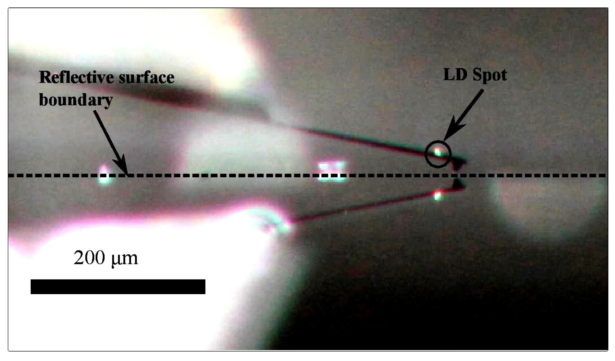 Previous to the start of the measurement, a SHOCONA cantilever is placed on a cantilever holder, which is then fixed on a custom mechanical support connected to the PZT, as shown in Figure 3b (3) and (4), then, the LD is focused at the cantilever. The alignment between the cantilever and the laser beam is confirmed by looking at the reflection of the laser spot on the cantilever through the camera, as shown in Figure 5. Once the alignment is confirmed, the XY table is calibrated and set at its origin until a sample is placed on the stage for measurement. After displacing the sample holder and the sample to the measurement coordinates, the cantilever is moved to the required working distance from the sample, and an offline test is performed to check that the OFI signal is working under the desired feedback regime (). After moving up the cantilever to prevent a collision with the sample, the XY table is moved to the initial scanning position. At this point, it is possible to change the starting scanning position relative to the initial preset coordinate. Next, the cantilever is approached as close as possible to the sample surface. The approach is controlled manually using custom software with the visual aid of the camera.