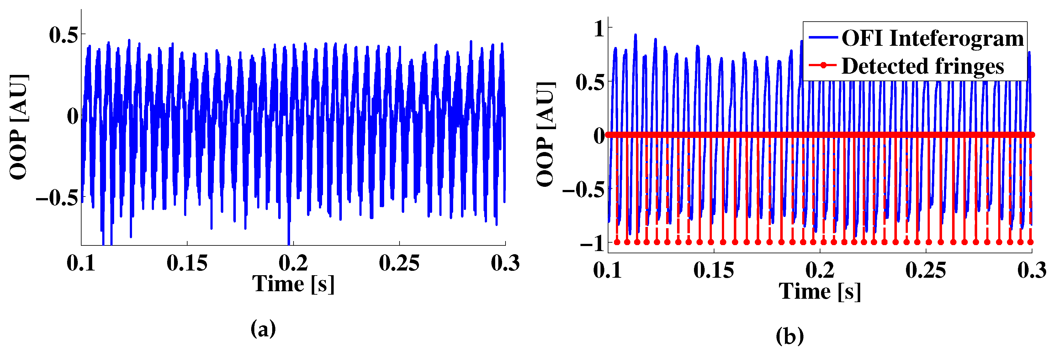 After the acquisition, the measurement sample (e.g., Figure 6) is band-pass filtered using an FFT-based filter with cutoff frequencies at and , where is the main frequency of the OFI signal. Next, the filtered OFI signal is treated with a fringe detection algorithm. For the case of signals presented in this paper, the fringe detection algorithm consists of the differentiation of the OFI signal, after which an initial fringe detection is performed using a threshold comparison method. The threshold is calculated as the RMS of the differentiated signal. After the initial fringe detection, a zero crossing algorithm is applied on the filtered OFI signal, and the detected positions are compared to those in the differentiated signal. This step allows one to remove the possible false positives of the first detection.