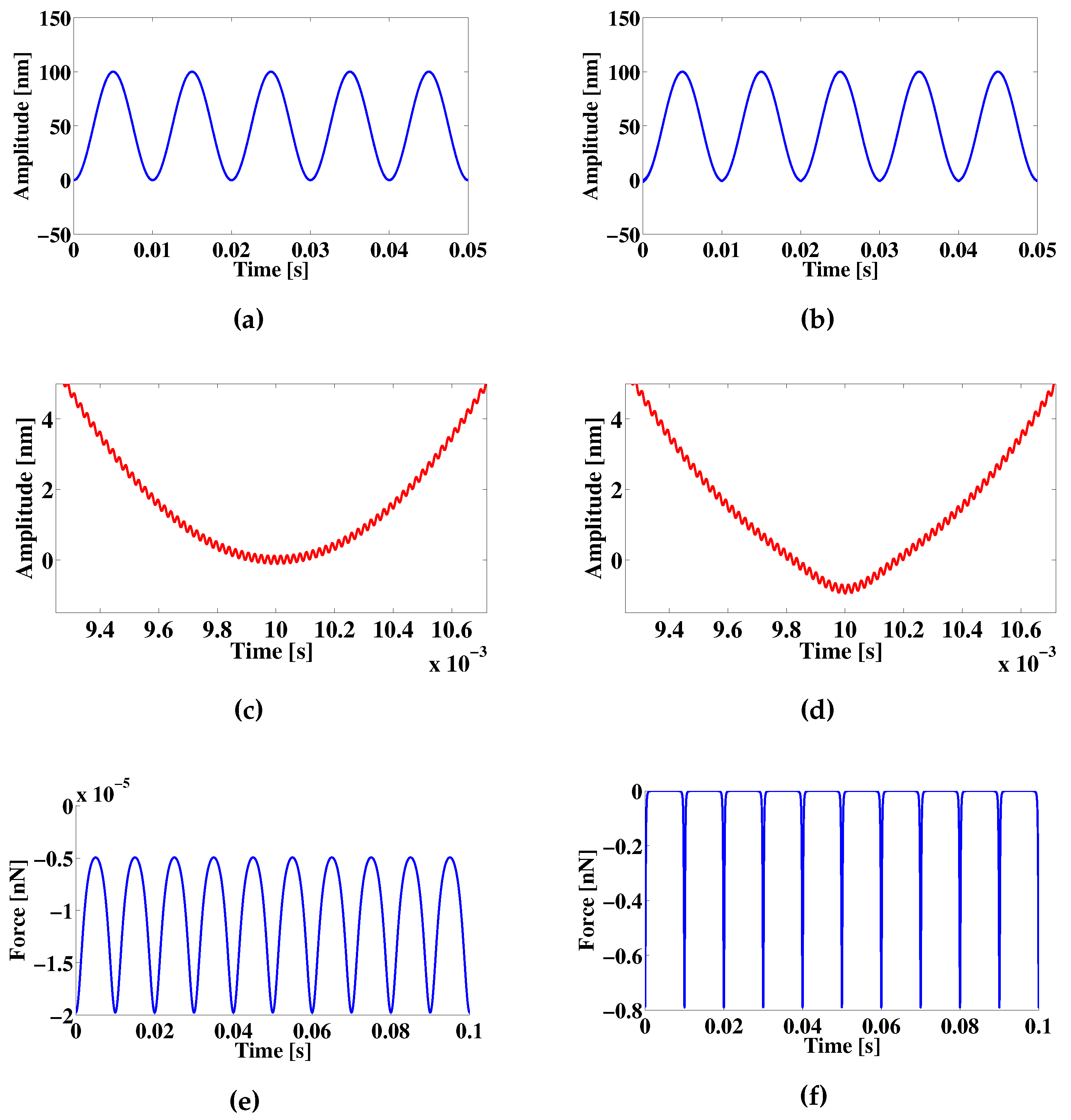 Example of a simulated cantilever tip behavior due to a harmonic motion. (a,b) Amplitude representation of a harmonic displacement with the tip placed for and respectively; (c,d) Zoom of the displacement amplitude around the region where the tip is closer to the sample; a deformation of the harmonic motion increases as the minimum tip to sample distance is reduced; (e,f) Corresponding force effect for and .