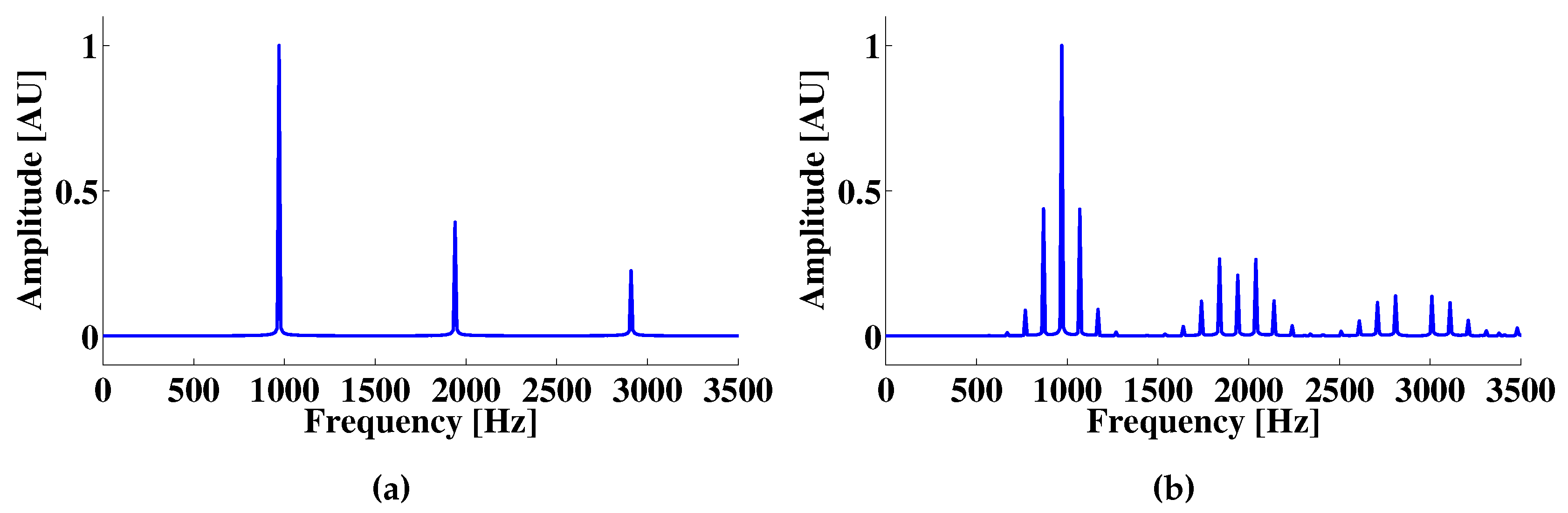 The resulting OFI signal contains the information of the reference velocity, as well as of the target displacement, as is displayed in Figure 8b by the frequency peaks induced over the spectra due to the Doppler effect. It should also be noted that the normalized amplitude of the frequency peaks caused by the tip motion is dependent on the force resulting in a value of AU for and AU for . For the presented simulation, the frequency resolution is limited to 10 Hz. In the case of non-multiple frequencies, the peaks caused by the cantilever vibration become wider, and as in the previous case, their amplitude also changes as a function of their proximity to the simulated sample.