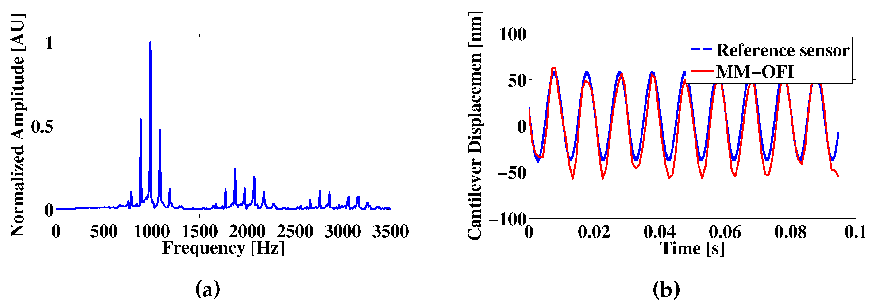 The results obtained in the previous section show the feasibility of a mechanically-modulated OFI sensor for detecting a cantilever sinusoidal motion with peak to peak amplitudes going from 100 to 200 nm. Previous results with the technique [25] show that a practical resolution of 3 nm can be reached, thus allowing the capture of 10-nm amplitudes with sufficient detail.