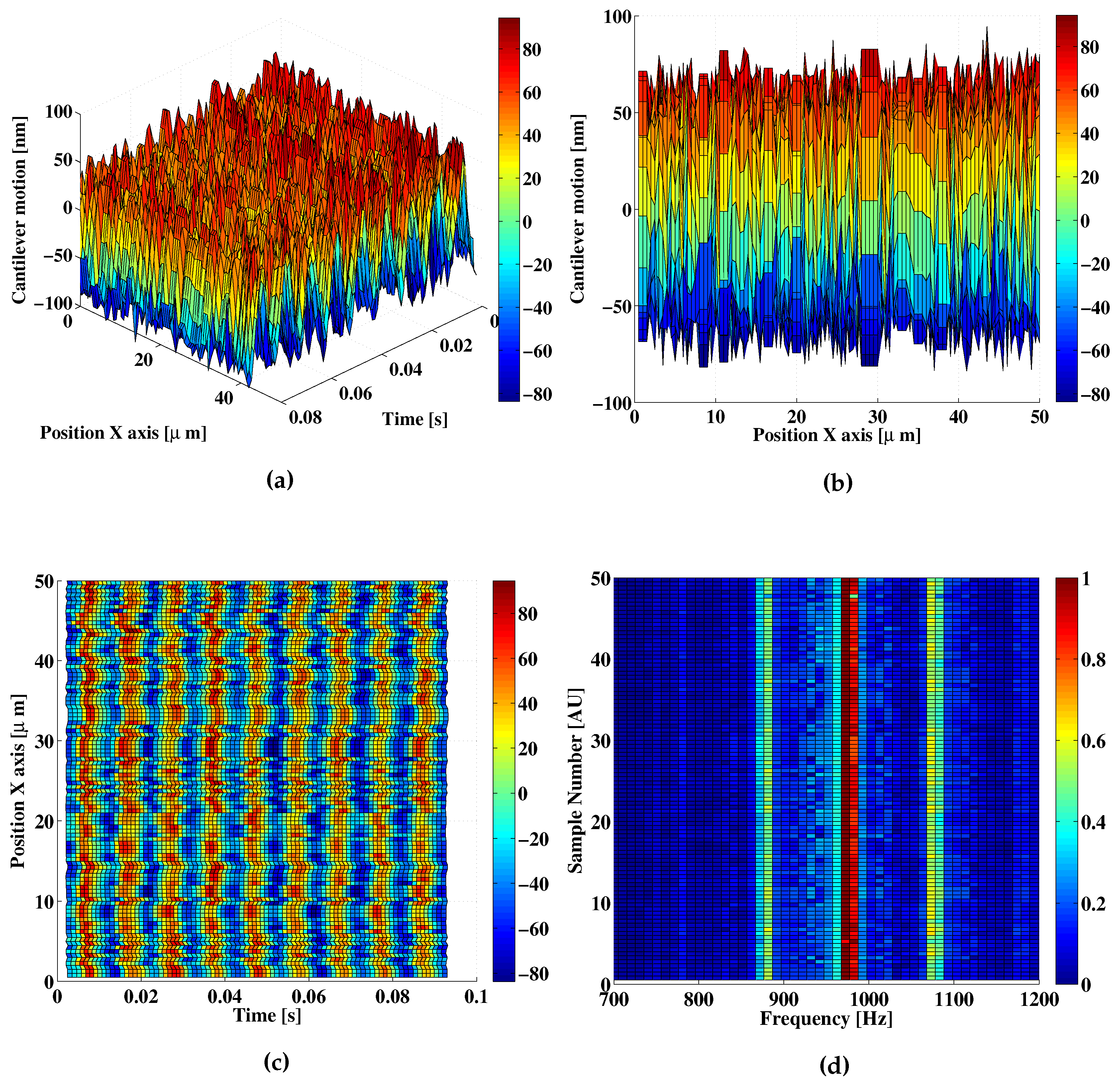 Example of an experimental -nm cantilever displacement reconstruction under uncontrolled acoustic and mechanical noise conditions. The displacement is shown in different projections: (a) 3D; (b) top and (c) lateral view; (d) The top view of the Fourier spectra around the main harmonic of the OFI measurement signal for each of the points acquired in the X-axis.