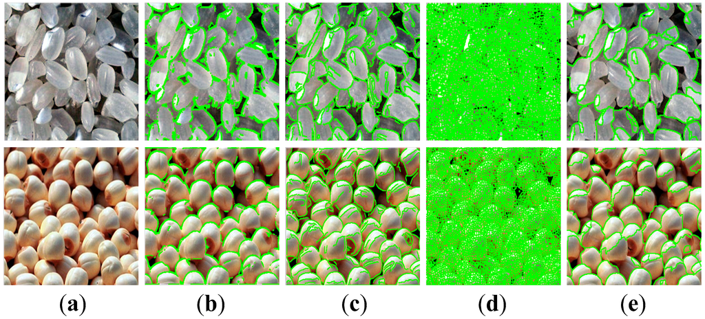 GPI is a kind of special image without a distinct foreground and background in terms of the morphological structure of GP. It is very difficult to distinguish independent objects (particles or local homogeneous fragmentations) from the GPI based on the commonly-used image segmentation methods. Hence, the physical attributes of individual objects cannot be extracted efficiently and credibly from the GPI, which brings great challenges in GPI processing and analysis and consequently causes a huge obstacle in the OPQI. Figure 1 displays two kinds of typical GPIs with their segmentation results by four different classic algorithms, captured from rice processing and lotus seed screening lines, respectively. As can be seen from Figure 1, commonly-used image analysis technologies are deficient in GPI processing and analysis.