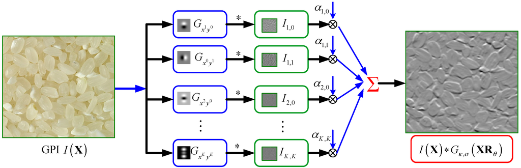 Hence, if we obtain the linear weighting coefficient , we can achieve ISS at any orientation with the steerable filter via a weighted summation of several base GDF responses of the GPI I at a very low computational cost. The computing mode of the steerable filtering is displayed in Figure 2.