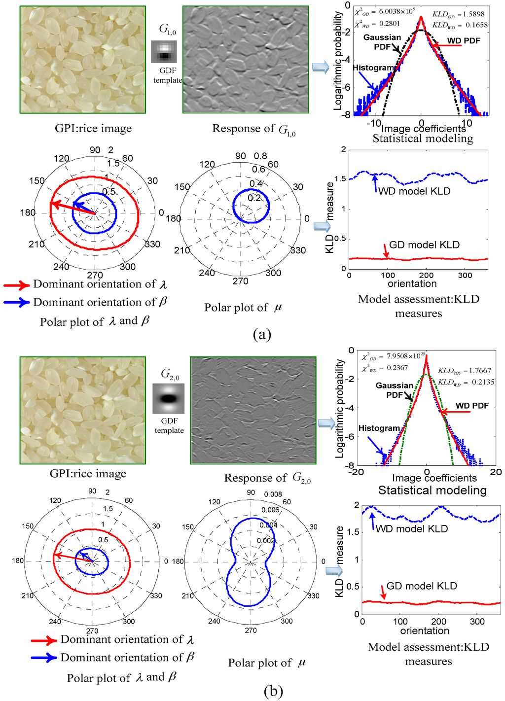 Illustrative example of extracting the omnidirectional ISS feature of a GPI. The omnidirectional WD-MPs are displayed in polar plots with two steerable filter templates with different derivative orders. The fitting accuracies with WD model and GD model ofISS are also compared and displayed with measures of statistics KLD and , which indicate clearly that the WD model is much better than the GD model to do statistical modeling of the ISSI of grain images. (a) GPI feature extraction with a first-order GDF template G1,0; (b) GPI feature extraction with a second-order GDF template G2,0.