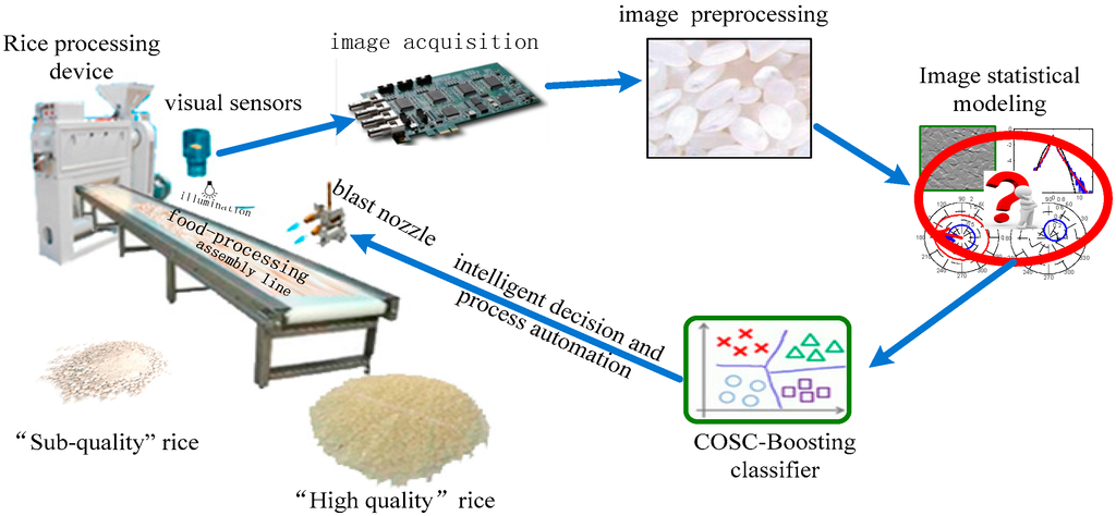 The topic of online product quality inspection (OPQI) with smart visual sensors is attracting increasing interest in both the academic and industrial communities on account of the natural connection between the visual appearance of products with their underlying qualities. Visual images captured from granulated products (GPs), e.g., cereal products, fabric textiles, are comprised of a large number of independent particles or stochastically stacking locally homogeneous fragments, whose analysis and understanding remains challenging. A method of image statistical modeling-based OPQI for GP quality grading and monitoring by a Weibull distribution(WD) model with a semi-supervised learning classifier is presented. WD-model parameters (WD-MPs) of GP images’ spatial structures, obtained with omnidirectional Gaussian derivative filtering (OGDF), which were demonstrated theoretically to obey a specific WD model of integral form, were extracted as the visual features. Then, a co-training-style semi-supervised classifier algorithm, named COSC-Boosting, was exploited for semi-supervised GP quality grading, by integrating two independent classifiers with complementary nature in the face of scarce labeled samples. Effectiveness of the proposed OPQI method was verified and compared in the field of automated rice quality grading with commonly-used methods and showed superior performance, which lays a foundation for the quality control of GP on assembly lines.