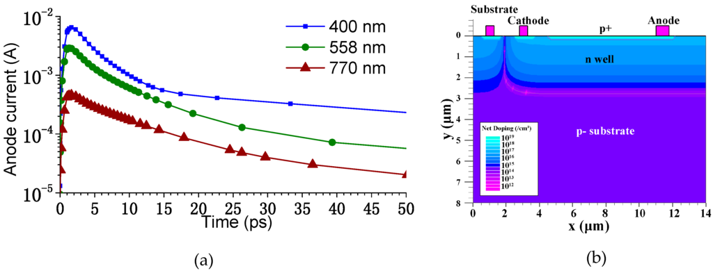 (a) The simulated transient response of the p+/n-well photodiode at three different wavelengths; (b) The structure of the photodiode used in the transient simulation.