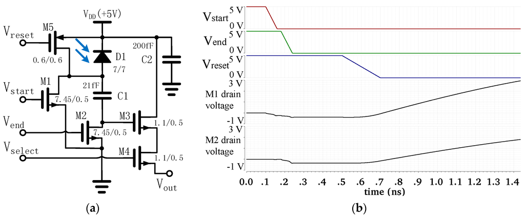 A timing chart for Vstart, Vend, Vreset, and the simulated results of the drain voltages of M1 and M2 is shown in Figure 2b. In the simulation, a 6.25-fF capacitor representing the parasitic capacitance was added between the bottom plate of C1 and the ground. Figure 2b shows that the M2 drain voltage drops to around −0.396 V after Vend has been pulled down to ground. This value is acceptable as the simulated leakage current of the 0.396-V forward-biased p− substrate/n+ drain diode of M2 is only 216 pA at room temperature. The relatively large parasitic capacitance between the bottom plate of C1 and the grounded p− substrate is the key to keeping the M2 drain voltage from dropping deeper, while it also restricts the sensitivity of the proposed image sensor.
