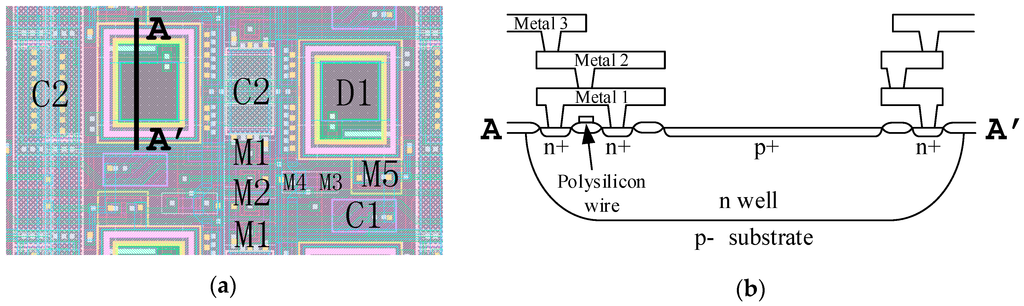 (a) The layout of two pixels; (b) Cross-sectional diagram of the p+/n-well photodiode in a pixel.