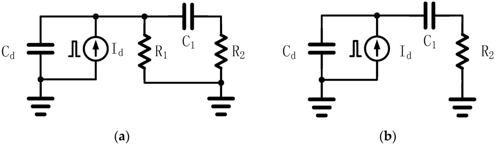 Figure 4b shows the simplified circuit model of a pixel during exposure, when transistor M1 is off and M2 is still on. It can be assumed that the current source Id emits a short enough current pulse with a total charge Qp during the shutter “open” state. If t2 denotes the time interval after the current pulse and Q2 denotes the charge on capacitor C1 at time t2, Q2 can be expressed as