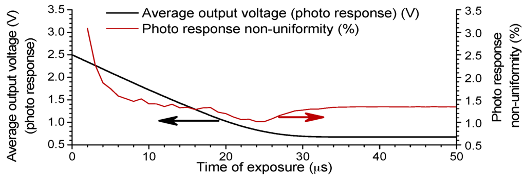 Figure 6 shows the measured photo response curve and the photo response non-uniformity (PRNU) between pixels of the proposed image sensor. The photo response curve and the PRNU were obtained by varying the exposure time, while keeping a constant uniform illumination by a blue LED. The measured PRNU for the selected area at half of the saturated voltage for all columns, odd columns only and even columns only was 1.39%, 1.42%, and 1.28%, respectively. This is normal and the difference in the pixel layouts for the odd and even columns show no significant influence on the PRNU.