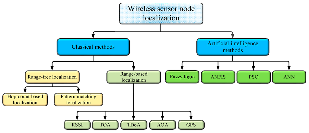 There are several techniques used in WSN localization. These techniques can be classified into two categories: classical localization techniques and artificial intelligence techniques that use soft computing optimization algorithms, as shown in Figure 1. Classical localization techniques have been introduced in previous research works and include range-based and range-free. The range-based method can be used to estimate the distance or angle between sensor nodes. This method has a high level of accuracy but requires extra hardware. Examples of this approach is time of arrival (ToA) [], phase of arrival (POA) [], angle of arrival (AoA) [], time difference of arrival (TDoA) [], received signal strength (RSS) [], acoustic energy [], and global positing system (GPS) []. In contrast, the range-free method has a low level of accuracy for the estimation of the sensor node location while being cost-effective []. It depends on the connectivity between fixed nodes, known as anchor nodes, and a further mobile or stationary sensor node. The range-free method determines the position of the sensor node without achieving distance estimation []. Examples of this approach are the centroid localization technique [], weighted centroid localization technique [],hop-count-based localization [], and the pattern matching method []. Artificial intelligence localization techniques have been used in previous research, including Artificial Neural Network (ANN) [], Neural Fuzzy Inference System (ANFIS) [], Fuzzy logic [], and optimization algorithms, such as Genetic Algorithms [], Particle Swarm Optimization (PSO) [], Bacterial Foraging Algorithm (BFA) [], and Gravitational Search Algorithm (GSA) [].