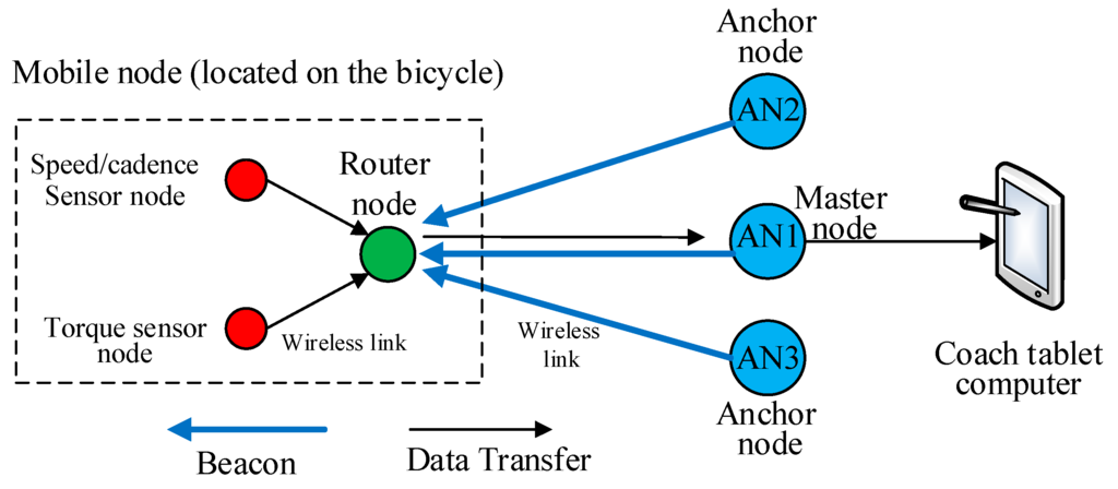 Several studies adopting different approaches for wireless positioning on a bicycle track have been conducted. The location and speed of an athlete were monitored in [] using GPS as part of a server-based mobile coaching system (MCS). An MCS was used in the Advanced and Adaptive Network Technology (ANT) wireless protocol to monitor the biomechanical and physiological parameters of the bicycle and the cyclist, respectively. In research work [], a remote mobile monitoring system (RMMS) was implemented using a ZigBee WSN. This RMMS was able to monitor physiological and biomechanical parameters using several sensors that transmitted their data to the coordinator node, which communicated with a small laptop that was fixed to the bicycle handle bar. Bicycle location was estimated using GPS, which was installed on the bicycle laptop. Location information was sent to a remote server to be monitored by a remote user.