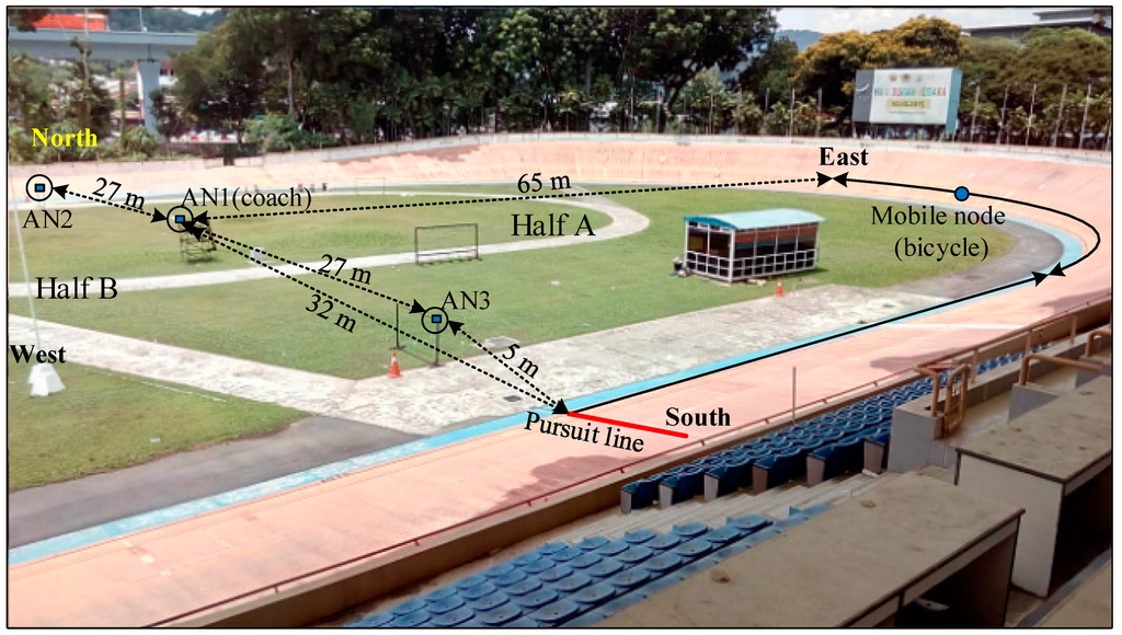 The proposed bicycle wireless sensor network (BWSN) topology is shown in Figure 2. The topology consisted of three ZigBee (XBee Series 2) anchor nodes, one ZigBee router node (RN), and two ZigBee sensor nodes (SNs). The RN and SNs, which moved along with the bicycle, are hereafter called the “mobile node”. The anchor nodes, namely AN1, AN2, and AN3, were mounted on a surface 1.5 m above the ground to avoid ground signal reflection or the Fresnel zone [], while the router node was fixed under the bicycle seat, which was 0.85 m above the ground. AN1, which was located at the centre of the track cycling field, handled the reception of the bicycle parameters (i.e., speed, cadence, and torque) and sent a beacon signal to the mobile node for distance measurement. The data received by AN1 were displayed on the coach’s laptop or tablet to allow the coach to monitor the cyclist’s performance. AN1 could be connected to the coach’s laptop or any smart device, thus did not encounter any issue related to power consumption. The AN2 and AN3 were powered from the main AC source. Both AN2 and AN3 were not connected to AN1 but they operated independently. The anchor nodes AN2 and AN3 were 27 m away from AN1, as shown in Figure 3. The anchor nodes AN2 and AN3 were fixed at the north and south sides of the track to establish a consistent communication link with the bicycle node. AN2 and AN3 could not be located at the east or west sides because the mobile node on the track would have been at the farthest distance (130 m) from them, which would have resulted in a loss of communication. AN1, AN2 and AN3 sent a beacon signal to the mobile node for distance estimation purposes. Experiments were conducted in both outdoor and indoor environments.