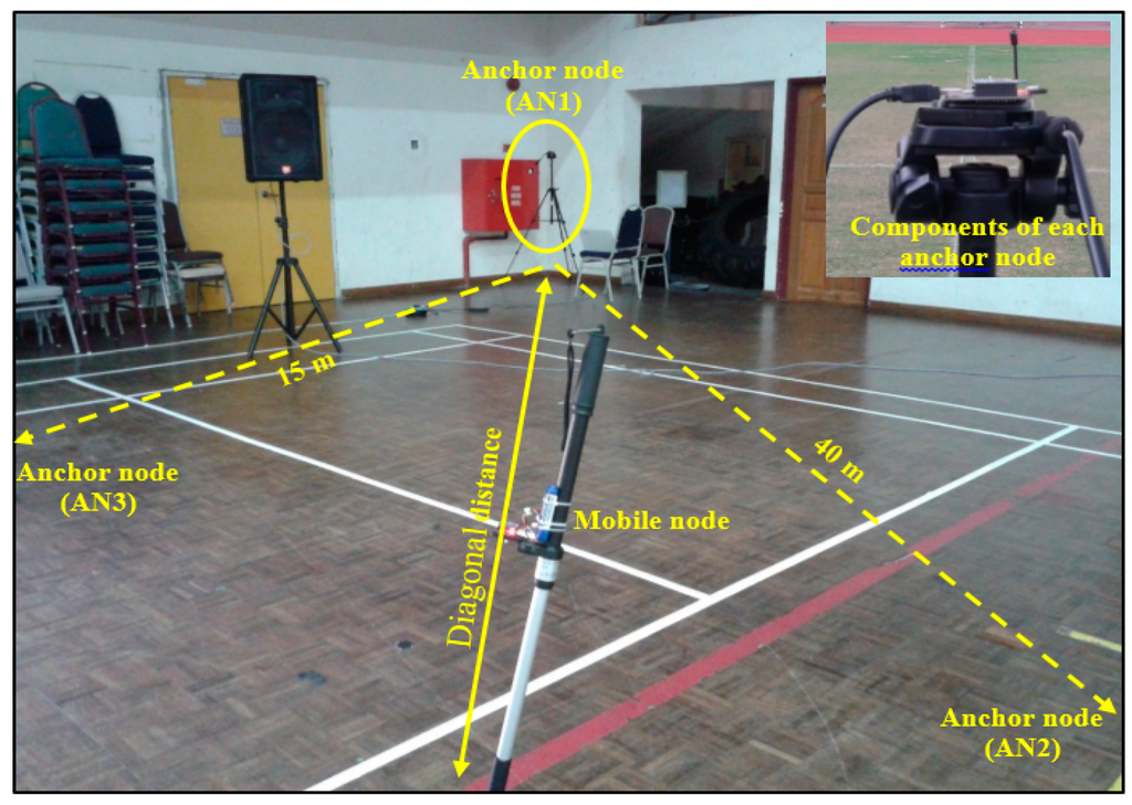 The outdoor experiment was performed on a track cycling field (the Cheras velodrome, located in the middle of Kuala Lumpur, Malaysia). AN1 was located at the centre of the cycling field. The anchor nodes AN2 and AN3 were 27 m away from AN1 and the mobile node received the beacons from the anchor nodes to collect the RSSI data, as shown in Figure 3. The track cycling field area was 130 m × 65 m and 333 m long. The minimum and maximum distances between AN1 and the mobile node were 32 m (width of the velodrome) and 65 m (length of the velodrome), respectively, as measured from the centre of the field (Figure 3).