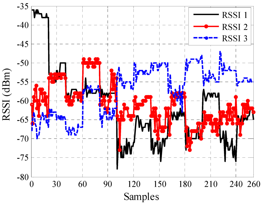 Measured RSSI values at the mobile node for three anchor nodes on a number of samples for each anchor node (300 samples) in the outdoor velodrome.