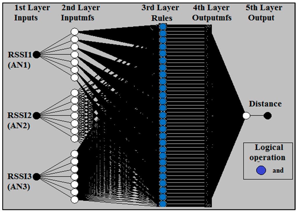 ANFIS is a technique for the evolution of self-organizing neuro-fuzzy systems []. ANFIS is employed to perform non-linear estimation algorithms, which in this case is the collected RSSI data. ANFIS has been used in research [,,,,,] to estimate the location of the nodes or distance between nodes in WSNs. In this work, the ANFIS structure shown in Figure 7 was adopted. The ANFIS input is the three RSSI values from three anchor nodes AN1, AN2, and AN3 for outdoor and indoor as shown in Figure 4 and Figure 6.