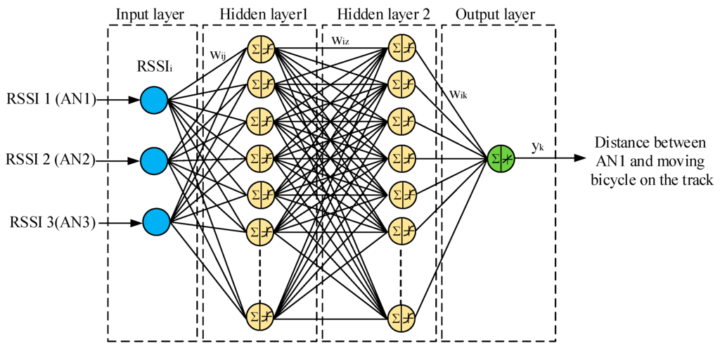 ANN is an information processing system which has been developed as a generalized mathematical model of human biological nerves []. ANN-based localization techniques are able to model the complex mathematical relationship between the input variables (RSSI in current work) and target variable (distance). In this work, a BP neural network type and the Levenberg–Marquardt (LM) training algorithm were selected for training, testing, and validating. The LM training algorithm was selected because it gives minimum localization error, as proven in [], in addition to its speed and efficiency. However, the LM algorithm requires a considerable amount of working memory []. For training, testing, and validating ANN, the same amounts of RSSI values which were used in ANFIS could be used for ANN to accurately determine the distance between the bicycle on the track and the coach for outdoor and indoor velodromes. In the ANN parameters the number of inputs, number of hidden layers, number of neurons in each hidden layer, learning rate, and the number of outputs must be determined before training, testing, and validating the data. In this paper, a four layer ANN architecture was built to determine the distance from the mobile node to the coach, based on the RSSI measurements of the anchor nodes. These layers included an: (i) input layer; (ii) first hidden layer; (iii) second hidden layer; and (iv) output layer, as shown in Figure 8. The input layer consisted of three RSSI values from the three anchor nodes, and the neurons in this layer only acted as a buffer for distributing the input signals RSSIi (i = 1, 2, 3, …, n) to the neurons in the first hidden layer. The input RSSIi were weighted against the strengths of particular connections wij and summated by each neuron of the first hidden layer to pass the output of the first hidden layer to the neurons of the second hidden layer. The inputs of the second layer were weighted against the strengths of particular connections wiz and summated by each neuron of the second layer to calculate the output yk in the fourth layer. The first and second hidden layers used the tansigmoidal activation functions to cover all ranges of the negative RSSI values, whereas the output layer employed the linear activation functions to cover the positive values of distance. The first and second hidden layers consisted of number of neurons in each hidden layer. The number of neurons in each hidden layer and learning rate were selected based on the optimization algorithms (PSO, GSA, and BSA) because this parameter selection was not secure and subject to the trial-and-error method, which does not always provide the optimum solution. The PSO, GSA, and BSA algorithms address such a problem by determining the best number of neurons in each hidden layer and the optimum learning rate of ANN. Thus, the performance of ANN can be improved. In this case, these algorithms could be hybridized with ANN to form three different algorithms, which were known as the hybrid PSO-ANN algorithm, hybrid GSA-ANN algorithm, and hybrid BSA-ANN algorithm through which ANN was able to achieve a minimum distance error.