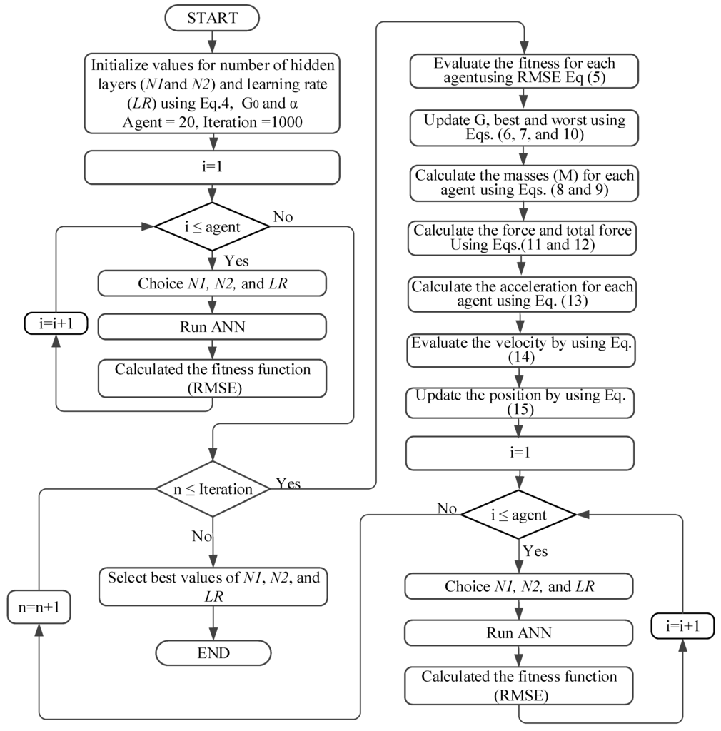 The details of the operation of the hybrid GSA-ANN based on the previous equations are shown in the flow chart in Figure 9.