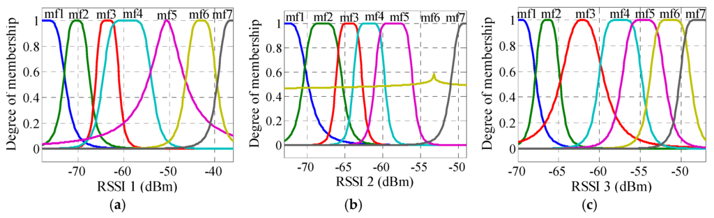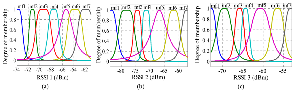 ANFIS seven gbellmfs input of outdoor velodrome (a) RSSI 1; (b) RSSI 2; and (c) RSSI 3.