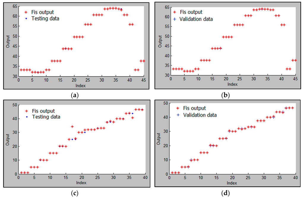 Comparison of transient characteristics for ANFIS (a) testing and (b) validation data for the outdoor velodrome and (c) testing and (d) validation for the indoor velodrome.