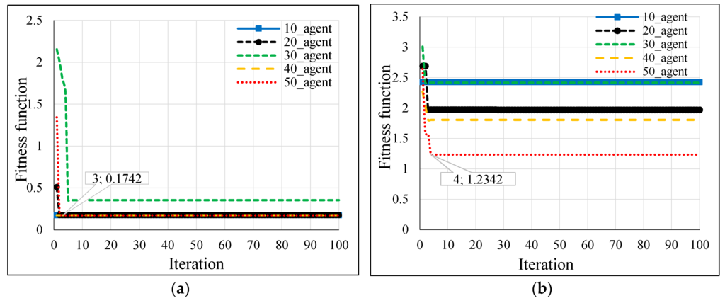 where N is the number of agents, is the position of ith agent in the dth dimension and k is the space dimension. To compute the fitness function of GSA, a root mean square error (RMSE) can be used to determine the best and the worst fit for each iteration. The computations aim to minimize the problems and determine the masses of each agent as follows []: