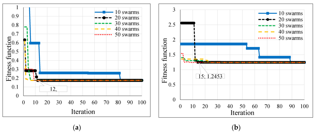 PSO fitness function versus iteration for (a) outdoor and (b) indoor velodromes.
