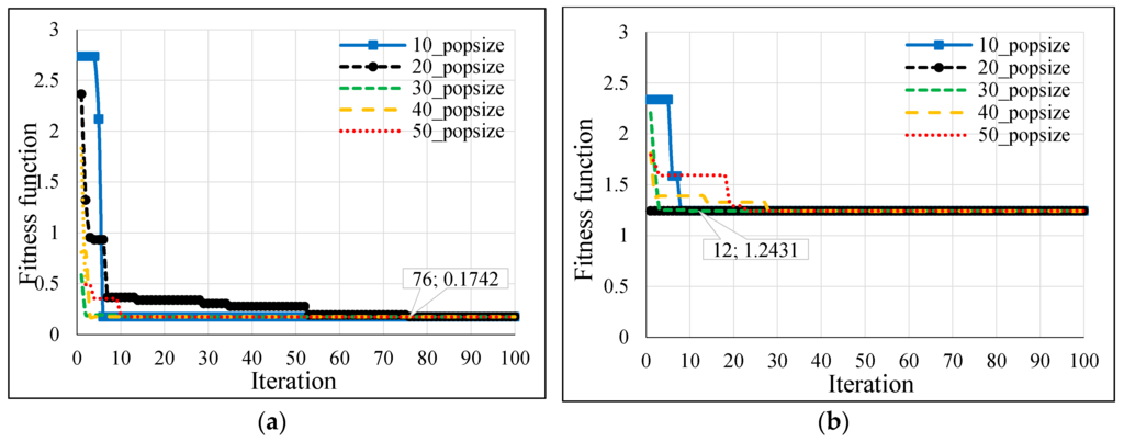 Several population sizes were simulated in Matlab for the hybrid GSA-ANN, hybrid PSO-ANN, and hybrid BSA-ANN to allow each heuristic algorithm to select the optimum number of neurons in each hidden layer and learning rate of ANN. Thereby, the minimum fitness function could be achieved. Table 3 shows the neurons of the hidden layers (N1 and N2) and LR, which were obtained from the implementation of each heuristic algorithm in Matlab based on different population sizes for outdoor and indoor velodromes. The fitness functions of the hybrid GSA-ANN, hybrid PSO-ANN, and hybrid BSA-ANN for different population sizes are shown in Figure 13, Figure 14 and Figure 15, respectively, for outdoor and indoor environments.
