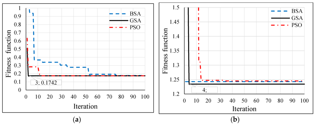 Fitness function comparison of GSA, PSO, and BSA for (a) outdoor and (b) indoor velodromes.