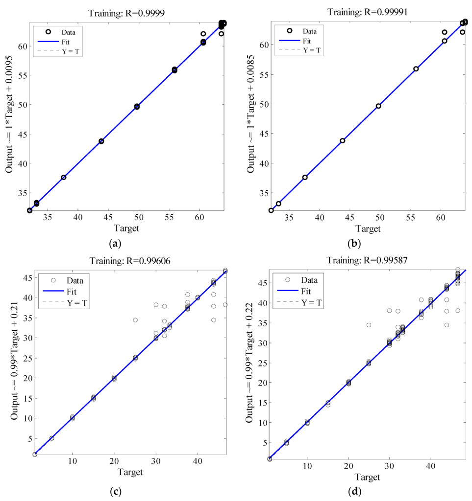 Figure 17 shows the testing and validation data of ANN. The actual distance (i.e., the target on the x-axis) for the outdoor and indoor velodrome is plotted against the estimated distance (i.e., output on the y-axis). The regression coefficient (R) of determination between the actual and estimated distance is a good indicator for the investigation of the prediction performance of the hybrid GSA-ANN algorithm. From Figure 17a,b for the outdoor velodrome, the R values were 0.9999 (testing) and 0.99991 (validation). For Figure 17c,d for the indoor velodrome, the R values were 0.99606 (testing) and 0.99587 (validation). The regression coefficient results suggested a close agreement between the actual and estimated distances.