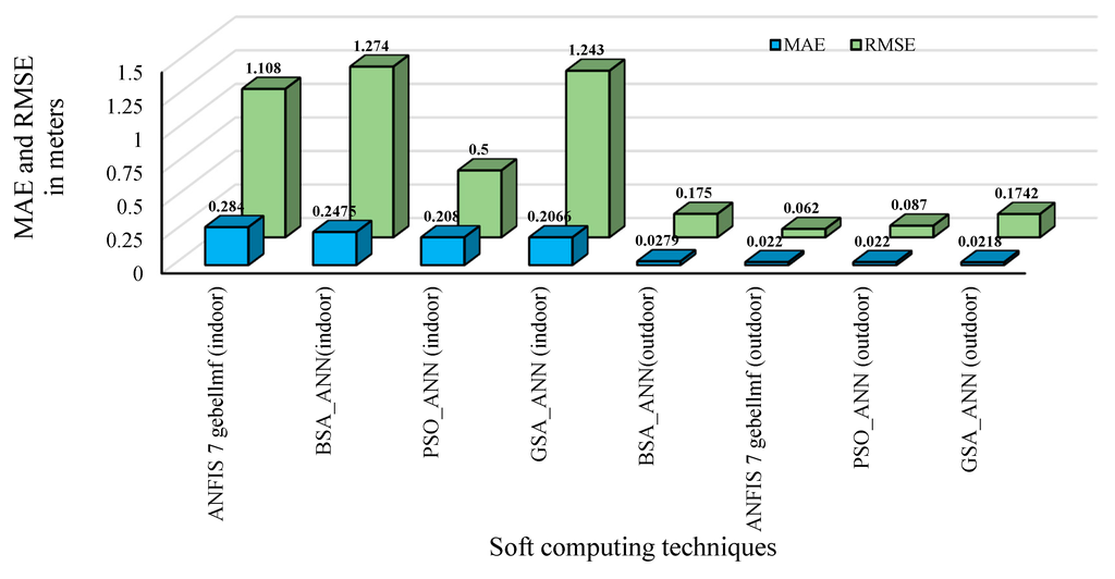 It can be observed that there was a small difference between MAE and RMSE for the case of outdoor, as shown in Figure 18, which was expected due to the lesser signal attenuation. In contrast, the gap between RMSE and MAE was very huge, suggesting that the variance error in terms of accuracy is large for indoor samples. The figure shows that MAE and RMSE for outdoor are better than indoor for all adopted techniques, whereas the hybrid GSA-ANN was best for outdoor and indoor velodromes. MAE of hybrid GSA-ANN was improved by 27% and 16% relative to ANFIS seven gbellmfs and hybrid BSA-ANN, respectively, for the indoor velodrome, whereas the MAE of hybrid GSA-ANN was improved by 21% relative to the hybrid BSA-ANN for the outdoor velodrome.