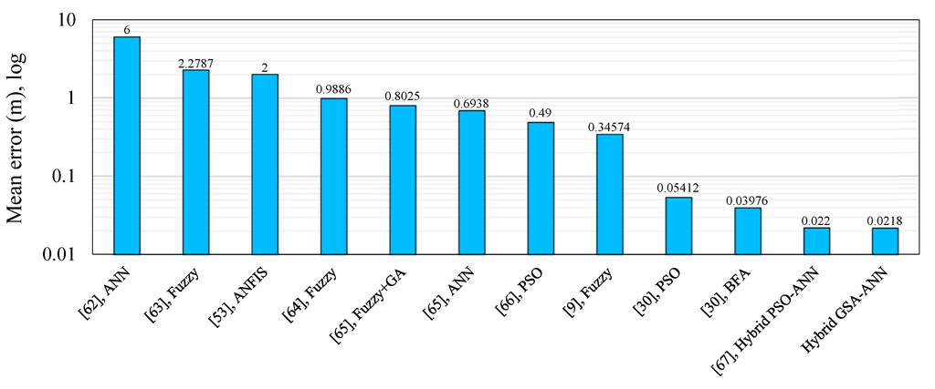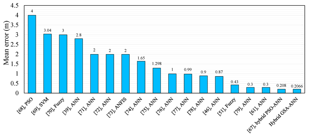 The hybrid GSA–ANN algorithm can be compared with previous works [,,,,,,,,,,,,,,,,,,,,,,,,] in terms of localization or distance error to validate our proposed system. Similar studies based on different soft computing techniques were considered for the purposes of comparison. The RSSI performance metric was employed as the input, whereas the location of the target node or the distance between the nodes in the network was used as the output. Most of these studies used ANN and Fuzzy Logic techniques to improve localization accuracy, and some of them used optimization algorithms such as PSO or hybrid techniques. Figure 19 (outdoor) and Figure 20 (indoor) show the comparison of the hybrid GSA-ANN with those works. The mean localization or distance error is considered a performance metric for the comparison between our work and previous studies. Our proposed hybrid GSA–ANN algorithm outperforms the algorithms or techniques of the other studies with its average distance errors of 0.0218 m and 0.2066 m for outdoor and indoor velodromes, respectively.