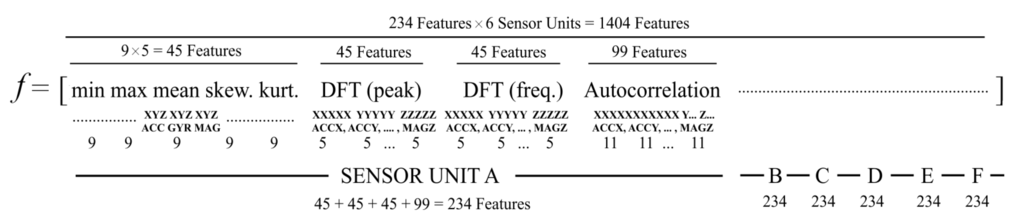 Here, represents the i-th element of discrete d vector. µ is the mean, and σ is the standard deviation of d. is the unbiased autocorrelation discrete-time sequence of d, and DFT(k) is the k-th element of N point DFT. Here, the maximum, the minimum, mean, skewness and kurtosis features are all scalar values. The autocorrelation feature has eleven values, and the DFT feature has ten values. Each sensor unit (MTw) is triaxial, ; therefore, in total, nine signals are recorded from a unit. Since there are six sensor units, 54 signals (9 signals × 6 sensors) exist, and a total of 270 features (54 signal × 5 features) are created for the first five scalar features. Similarly, 270 features are created for the first five DFT peak values, and the other 270 features are created for the five respective frequencies. Lastly, 594 features (11 × 9 × 6) are created for 11 autocorrelation sequences. The feature formation process resulted in a feature vector of dimension 1404 × 1 (270 + 270 + 270 + 594) for each test of the 4-s signal segments. Feature vector formation is shown in Figure 5. This feature vector was created for a single test. However, in this work, there are 2520 movements, including 1400 falls (14 volunteers × 20 falls × 5 repetitions) and 1120 ADLs (14 volunteers × 16 ADLs × 5 repetitions). Therefore, a feature set dimension of a 1404 × 2520 vector array is generated from 2520 features extracted from the movements.