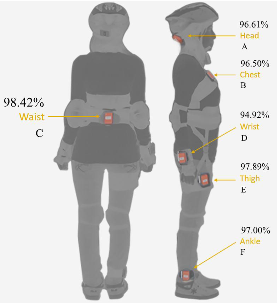 The BDM algorithm accuracy performances are promising and satisfactory. BDM produces 99.26% classification accuracy when six sensor units are used in the calculation; however, the best accuracy (99.90%) is achieved with the ECA sensor combination (right-thigh_waist_head). The waist sensor, labeled C, gives 99.24% accuracy itself.