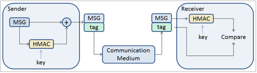 The technique implemented to authenticate the messages relies on a keyed-Hashed Message Authentication Code (HMAC) [17]. The idea is to generate a tag for the respective message, and then, the tag is appended and transmitted with the original message (Figure 1).